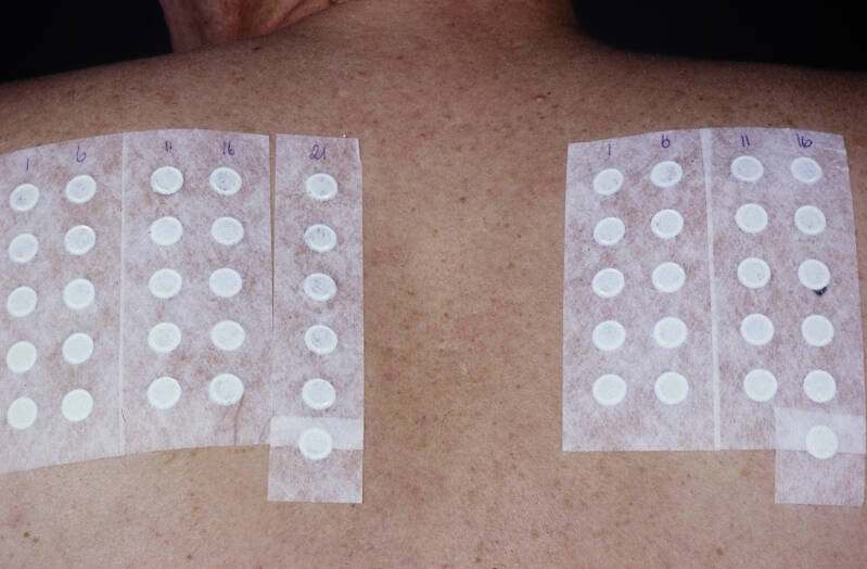 Allergic contact eczema is caused by skin or mucous membrane contact with a substance to which one is allergic, to which one has a contact allergy. The substance that causes the reaction is called the allergen. The definitive diagnosis is made with patch tests, also called epicutaneous allergy tests. A large number of frequent allergens and the patient's contact substances are applied to the back in plastic or aluminum tubs, and fixed with plasters. The materials are removed on day 2 (D2), and the reactions are read half an hour later. A second reading follows on D3 or D4, and if the procedure is performed very well, a third reading follows on day 7, as late reactions (appearing only after D3 or D4) are frequently observed.